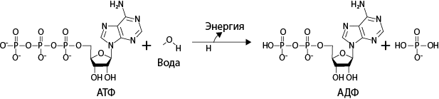 Рис. 13. Основной валютой биологической энергии на протяжении всей истории развития жизни является аденозинтрифосфат (АТФ). При соединении АТФ с водой в ферментах одна фосфатная группа может быть оторвана от молекулы, в результате чего образуется аденозиндифосфат (АДФ) и неорганический фосфат. Такая реакция высвобождает энергию, которую все клетки используют для жизни