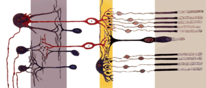 Упрощенная схема расположения нейронов сетчатки. Сетчатка состоит из нескольких слоев нейронов. Свет падает слева и проходит через все слои, достигая фоторецепторов (правый слой). От фоторецепторов сигнал передается биполярным клеткам и горизонтальным клеткам (средний слой, обозначен желтым цветом). Затем сигнал передается амакриновым и ганглионарным клеткам (левый слой). Эти нейроны генерируют потенциалы действия, передающиеся по зрительному нерву в мозг.