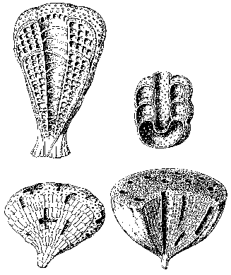 РИСУНОК 24. Археоциаты. (а) — Archaeocyatida, (б) — Capsulocyatida, (в) — Kazachstanicyatida, (г) — Archaeocyatida.