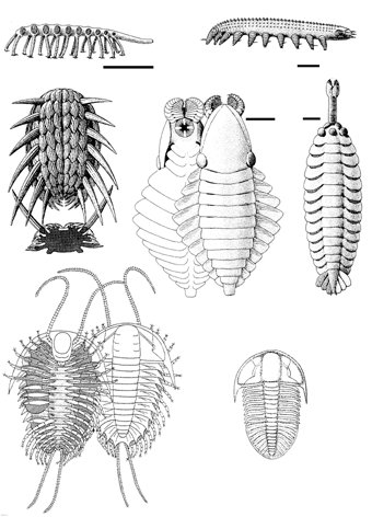 По всей видимости, целый ряд неродственных между собой групп начинает в это время независимо приобретать отдельные признаки членистоногих, и в результате они независимого достигают артроподного уровня организации. Подробнее о процессах параллельной эволюции, подобных этой «артроподизации», мы поговорим позже (в главе 12), пока же для нас существенно лишь само возникновение принципиально нового типа скелета, обладатели которого начинают играть ключевую роль в формирующихся экосистемах. Так, трилобиты становятся, по-видимому, основными потребителями того самого «упакованного» органического детрита, обогащающего донные осадки, и могут считаться настоящей эмблемой палеозоя.