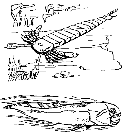Положение меняется в силуре, когда среди членистоногих появились крупноразмерные ракоскорпионы, а среди позвоночных — первые челюстноротые (настоящие рыбы). Судя по всему, обе эти группы возникли в опресненных прибрежных акваториях (типа лагун): здесь они были на первых порах избавлены от конкуренции с головоногими, которые избегают участков моря, «отравленных» стекающими с суши пресными водами. Именно в это время ракоскорпионы (например, Pterygotus) достигают длины свыше 2 м (а если с клешнями — то почти 3) и становятся властелинами силурийских морей — по крайней мере, их прибрежных участков (рисунок 26). Прямые головоногие не выдерживают конкуренции, и их разнообразие заметно сокращается; попытки спастись за счет гигантизма (раковины Endoceras, например, достигали 4 м в длину — хотя сам моллюск был, понятное дело, много меньше) не имели успеха.