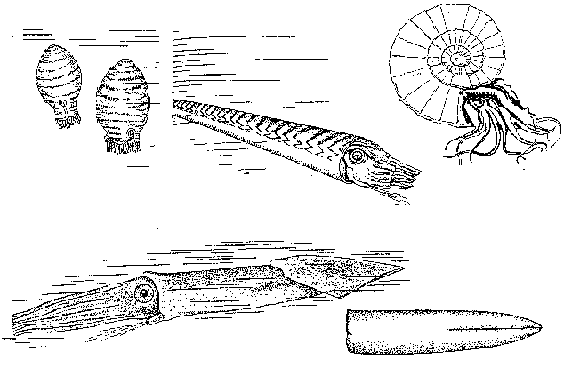 И вновь головоногие нашли выход: с этого времени начинается расцвет групп, имеющих внутреннюю раковину — белемнитов и происходящих от них кальмаров. Вообще-то белемниты появились еще в карбоне, однако до сих пор они пребывали на вторых ролях. Теперь же, когда возможности пассивной защиты оказались исчерпаны, стратегия белемнитов — отказ от раковины в обмен на увеличение скорости передвижения — оказывается генеральной линией эволюции головоногих. Судя по всему, внутреннераковинные головоногие оказались самыми скоростными обитателями мезозойского океана; они, казалось бы, должны столкнуться с тою же проблемой устойчивости в движении, что и прямые головогоногие (см. выше), однако их тело, лишенное раковины, способно выравнивать «полет» при помощи плавников-стабилизаторов (рисунок 27, г). При этом отсутствие таких ограничителей роста, как твердые покровы членистоногих, позволяет им достигать очень крупных размеров. Современный гигантский кальмар достигает в длину 18 м (со щупальцами) и является самым крупным беспозвоночным (на коже китов находили отпечатки присосок кальмаров, длина которых оценивается в 30 м), а ведь в прошлом вполне могли существовать и более крупные виды! Как бы то ни было, внутреннераковинные головоногие успешно дожили до наших дней и вымирать явно не собираются. Достаточно сказать, что в пробах грунта из глубоководных частей Тихого океана число челюстей кальмаров на один квадратный метр варьирует от нескольких десятков до нескольких сотен, что дает некоторое представление о численности (и экологической роли) этих животных в современных морях.