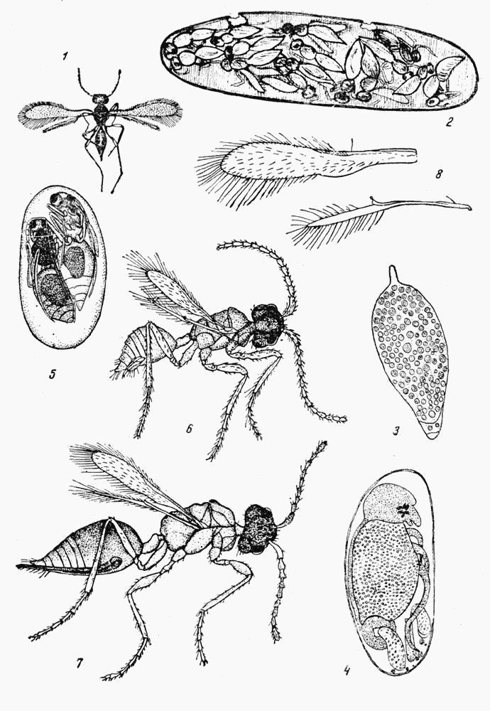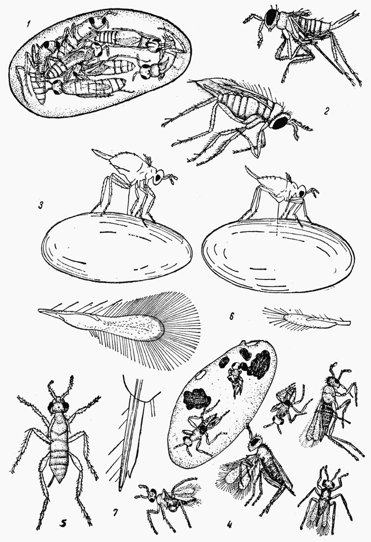 Таблица XLVIII. Водяной наездник - Prestw1chia: Рис. 1. Самцы прествичии в яйце жука Ilybius (по Римскому-Корсакову). - Рис. 2. Крылатая самка Prestwichia aquatica и самка с рудиментарными крыльями (по Римскому-Корсакову). - Рис. 3. Prestwichia aquatica в позе откладывания яиц (по Римскому-Корсакову). - Рис. 4. Самцы и самки Prestwichia aquatica, вышедшие и еще задержавшиеся в яйце (по Римскому-Корсакову). - Рис. 5. Самец Prestwichia aquatica (по Римскому-Корсакову). - Рис. 6. Переднее и заднее (направо) крыло самки Prestwichia aquatica (по Кригеру). - Рис. 7. Яйцеклад самки (по Кригеру).