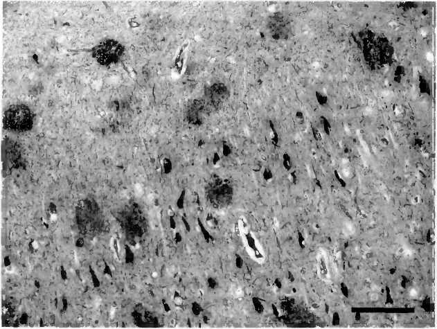 Рис. 28. В серебряном окрашивании по методу Галльяса среза коры больших полушарий 85-летнего пациента с болезнью Альцгеймера под микроскопом видны два типичных поражения мозга: содержащие амилоид большие круглые бляшки между нервными клетками и клубки в нервных клетках, отмеченные черным.