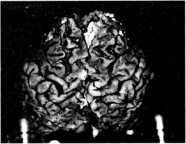 Рис. 29. При лобно-височной деменции происходит сильное сморщивание передней части мозга (в верхней средней часта), тогда как остальная часть мозга остается здоровой.
