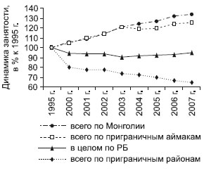 В Бурятии число занятых к уровню 1995 г. сократилось до минимального значения в 2003 г. – 90,6 %, к 2007 г. начало расти и составило – 94,9 %. В приграничных районах продолжается падение числа занятых, в 2007 г. их число составило – 64,6 % (26,5 тыс. чел.) от уровня 1995 г. Снижение числа занятых наблюдалось во всех приграничных районах, за исключением Окинского, где происходил рост числа занятых. В 2007 г. число занятых в Окинском районе составило 2,8 тыс. чел., в 1995 г. – 1,8 тыс. чел.
