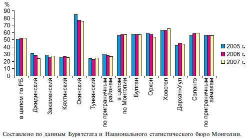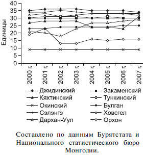 Таким образом, сравнение основных показателей социально-экономического развития приграничных территорий Бурятии и Монголии выявило существенную разницу в уровнях их развития, причем не в пользу приграничных районов Республики Бурятия. Следует отметить, что сравнительный анализ социально-экономического развития всех этих приграничных районов выполнить не просто в связи с отсутствием сопоставимых показателей, а также несовпадением методик ведения статистического учета в рассматриваемых странах.