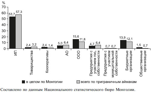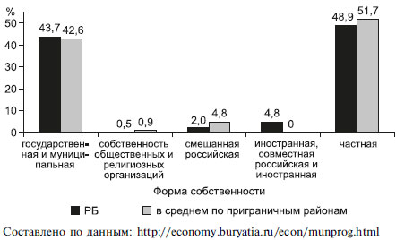 Общее количество учтенных в составе Статрегистра организаций в приграничных районах Республики Бурятия (Джидинский, Закаменский, Кяхтинский, Тункинский и Окинский) по состоянию на 01.01.2006 г. составляло 11 % от общего количества организаций Республики Бурятия. Причем сельскохозяйственные предприятия приграничных районов составляли 22 % от общего числа республиканских сельскохозяйственных организаций. Близкий показатель отмечался по предприятиям, занятым добычей полезных ископаемых – 16 %, по обрабатывающим производствам – 7, по предприятиям, производящим и распределяющим электроэнергию, газ и воду – 8, по строительным организациям – 4, по предприятиям оптовой и розничной торговли – 5, по гостиницам и ресторанам – 8, по транспорту и связи – 5 и по предприятиям, связанным с финансовой деятельностью – 14 %.