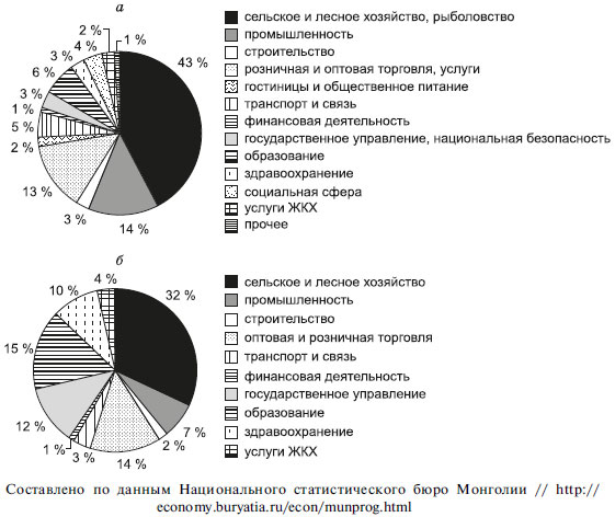 Рис. 12.5. Отраслевая структура занятых в приграничных аймаках Монголии (а) и районах Бурятии (б) в 2005 г.,%.
