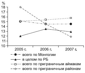 Уровень общей безработицы в приграничных аймаках постепенно повышался и составил в 2007 г. – 15,8 % (в целом по Монголии – 14,5 %). Высокая напряженность на рынке труда обусловлена тем, что, во-первых, в общей численности населения Монголии является высокой доля молодежи, у молодежи в возрасте от 20 до 24 лет, недавно выпустившейся из высших и средних специальных учреждений, довольно низкие возможности трудоустройства; во-вторых, начиная с 1990-х гг. происходит большой отток сельского населения в город, тем самым численность безработных пополнилась.