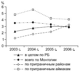 Хотя показатели зарегистрированной безработицы менее пригодны для анализа состояния рынка труда, необходимо отметить, что уровень зарегистрированной безработицы в Монголии снижается, но в приграничных аймаках остается высоким, составляя 4 %, что выше среднего по Монголии уровня – 2,8 % (рис. 12.7). В приграничных районах Бурятии уровень зарегистрированной безработицы постоянно увеличивается с 1,19 % в 2003 г. до 3,24 % в 2006 г. Прогнозируется дальнейшее увеличение уровня зарегистрированной безработицы, обусловленное следующими факторами: