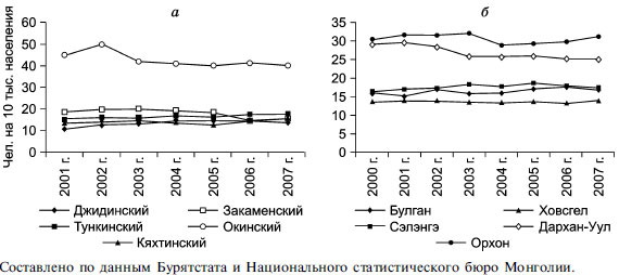 Рис. 12.8. Численность врачей в приграничных районах Бурятии (а) и Монголии (б), человек на 10 тыс. чел. населения.