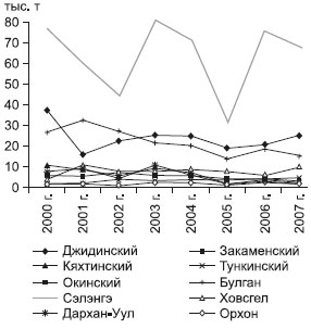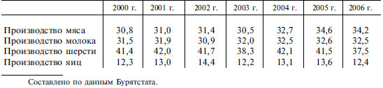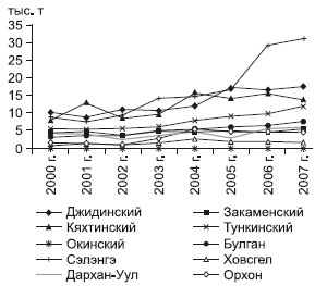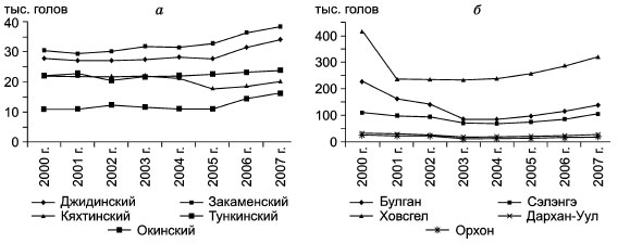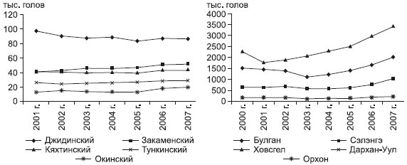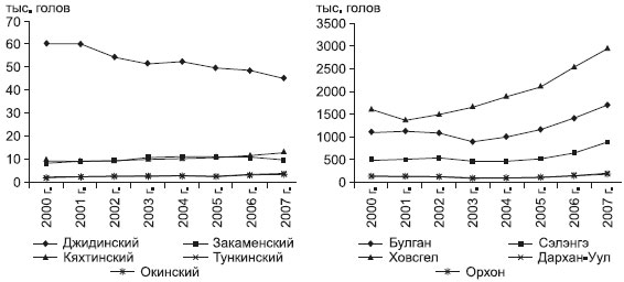 Динамика показателя, характеризующего поголовье скота в целом, в Бурятии с 2000 по 2006 г. практически не менялась. Напротив, в приграничных монгольских аймаках заметна тенденция к росту поголовья скота начиная с 2001–2003 гг.