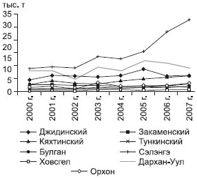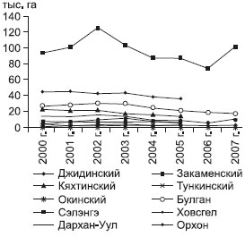 Растениеводство. Наибольшая площадь, используемая под посевы сельскохозяйственных культур среди приграничных аймаков Монголии, приходится на аймак Сэлэнгэ, а в Бурятии – на Джидинский район (рис. 12.12). Динамика посевных площадей почти во всех приграничных территориях имеет некоторую тенденцию к снижению. В целом по России наблюдалось сокращение площади сельскохозяйственных угодий в условиях перехода к рыночным отношениям, так в 1990 г. в Бурятии сельскохозяйственные угодья занимали 17,5 % общей площади, в том числе пашня – 30 %, а на 01.01.2008 г. – 9 %. Среди монгольских аймаков только в Сэлэнгэ, Дархан-Уул и Ховсгел в 2007 г. эта тенденция сменилась некоторым ростом. Из-за отсутствия достоверных данных невозможно получить полную сравнительную картину по динамике посевных площадей в приграничных районах Бурятии и Монголии в целом.