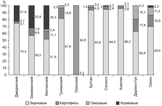 Во всех приграничных районах Бурятии, кроме Окинского, основную долю в посевах занимают зерновые культуры (от 51,6 до 81,6 %) (рис. 12.13). В Окинском районе кормовые культуры составляют 94,8 %. В монгольском приграничье структура посевных площадей выглядит более однородной, причем существенным является различие между аграрными (Булган, Сэлэнгэ и Ховсгел) и городскими (Дархан-Уул и Орхон) местностями, заключающееся в том, что в аграрных местностях подавляющую долю посевной площади (93,6-96 %) занимают зерновые культуры, а в городских местностях доля зерновых составляет 62,869,6 % площади.