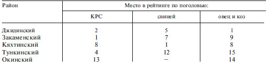 На начало 2007 г. среди всех районов республики лидирующие позиции по поголовью КРС, овец и коз занимал Джидинский район, по поголовью свиней первое место принадлежало Кяхтинскому району, где проживает значительная часть русского населения, занимающегося свиноводством. Тункинский и Окинский районы находятся на предпоследних местах в рейтингах (табл. 12.2).