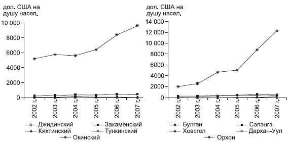 Среди бурятских приграничных районов лидирующее место по объему промышленной продукции на душу населения занимает Окинский район (на территории района развиваются золотодобывающие производства, при низкой численности населения), в Тункинском районе на душу населения приходится наименьшее количество промышленной продукции (рис. 12.20).