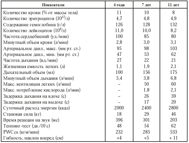 Количество крови у дошкольников относительно массы тела заметно больше (в 4 года – 11 % от массы тела, в 6–7 лет – 10 %), приближаясь к взрослому уровню в период младшего школьного возраста (в 11 лет – 8 %, у взрослых – 5–8%).