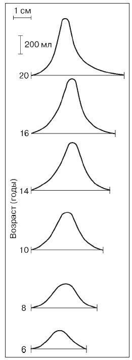 По мере роста и развития ребенка совершенствуется его дыхательный аппарат. Дыхание у детей частое и поверхностное. Легочная ткань мало растяжима. Бронхиальное древо недостаточно сформировано. Грудная клетка сохраняет еще конусовидную форму и имеет малую экскурсию, а дыхательные мышцы слабы. Все это затрудняет внешнее дыхание, повышает энерготраты на выполнение вдоха и уменьшает глубину дыхания. Дыхательный объем дошкольника в 3–5 раз меньше, чем у взрослого человека (рис. 50). Он постепенно увеличивается в младшем школьном возрасте (см. табл. 19), но еще заметно отстает от взрослого уровня.