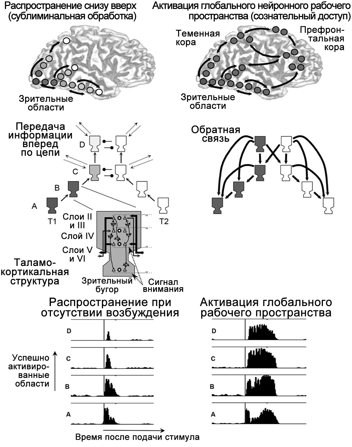 Рисунок 27. Компьютерная модель имитирует автографы бессознательного и сознательного восприятия. Мы с Жан-Пьером Шанжо с помощью компьютера имитировали ряд параметров многих зрительных, теменных и префронтальных областей, участвующих в сублиминальной и сознательной обработке данных (сверху). Четыре иерархические области соединялись между собой связями, обеспечивавшими передачу информации вперед по цепи и обратную связь на большие расстояния (середина). Каждая простимулированная область содержала клетки коры головного мозга, расположенные послойно и соединенные с нейронами зрительного бугра. Когда мы подали в сеть краткий импульс, активность стала распространяться снизу вверх, после чего сошла на нет; картина повторяла собой ту, что наблюдается при краткой активации кортикальных связей во время сублиминальной обработки данных. Немного продлив стимул, мы получили глобальную активацию: идущие сверху вниз связи усилили импульс и породили вторую волну длительной активации; это соответствовало активности, которая наблюдается во время сознательного восприятия