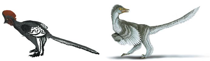 Многочисленные мелкие пернатые манирапторы найдены в отложениях юры и мела. Изображенные здесь анхиорнис и сяотингия из юры Китая были размером с ворону. Похоже, это ранние представители семейства птиц