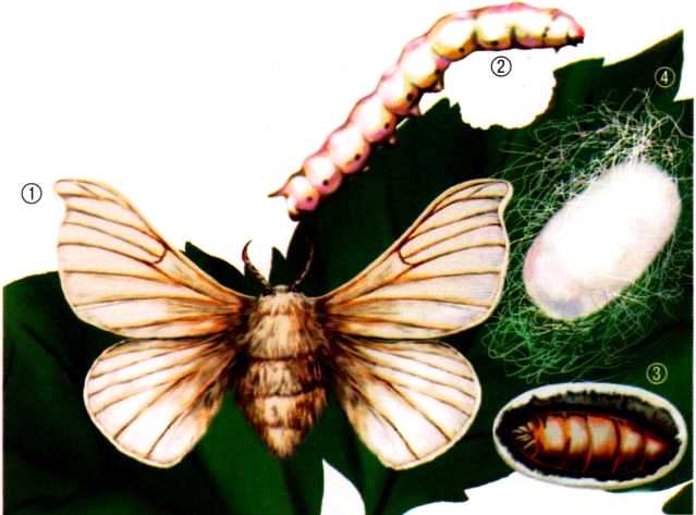 Метаморфоз тутового шелкопряда: 1. Бабочка 2. Гусеница 3. Куколка 4. Кокон