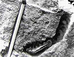 Раскоп гнезда роющей осы-подалония с зажаленной гусеницей озимой совки в ячее на дне шахтного хода. Слева для масштаба воткнута спичка. Отложив яйцо на гусеницу, лежащую в ячее, подалония тоже принимается маскировать ход в гнездо, сгребая песок щетинками на концах ножек.