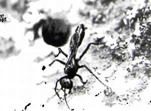Сфекс, втащив в норку тело парализованной атбасарки и отложив на нее яйцо, покидает нору, засыпает вход, маскирует его извне и больше сюда не возвращается.