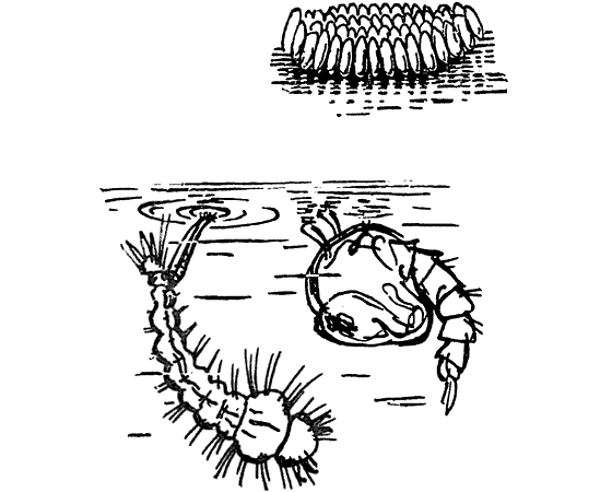 Личинки наших обычных комаров вдыхают воздух через тонкую трубку, на которой они как бы подвешены к самой поверхности воды. Время от времени личинки ныряют и, извиваясь, проникают в глубь вод.