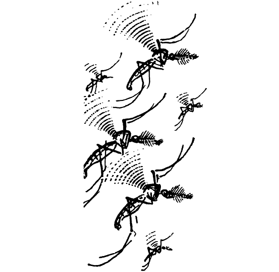 Трепещущие рои мошкары, которые часто, как дым, клубятся в воздухе, состоят исключительно из комариных самцов. Самки ныряют в эту кишащую массу и здесь находят себе жениха.