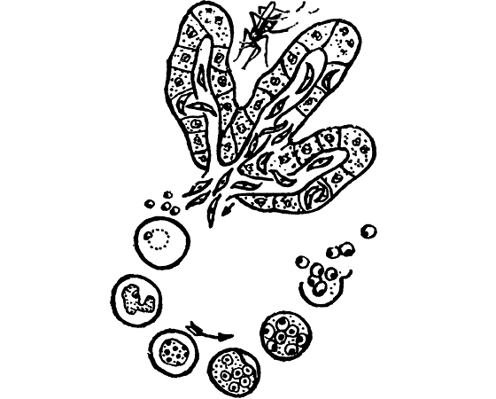 Когда насекомое сосет кровь больного, оно поглощает и содержащихся в кровяных тельцах паразитов. Новоселы какое-то время проводят в стенках желудка комара, здесь питаются и размножаются. Потом, послушные своей природе, проникают в слюнные железы комара; во время очередного приема пищи, когда в ранку, сделанную хоботком, вводится слюна, вместе с ней в кровь здорового человека попадают и паразиты, возбуждающие заболевание малярией.