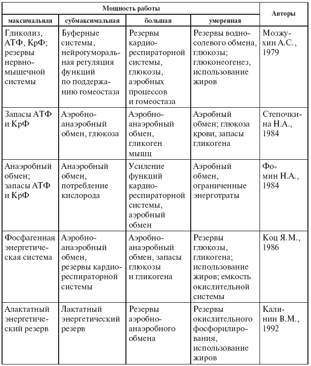 Наиболее важной характеристикой резервных возможностей организма является адаптационная сущность, эволюционно выработанная способность организма выдерживать большую, чем обычно нагрузку (Бресткин М.П., 1968). Исследование физической работоспособности спортсмена (особенно высшей квалификации) дает уникальный фактический материал для оценки и анализа функций организма в зоне видовых предельных напряжений. Поэтому можно считать, что лимитирующими факторами физической работоспособности спортсмена являются индивидуальные пределы использования им своих структурно-функциональных резервов различных органов и систем. В табл. 8 (данные различных авторов) представлены основные сведения по характеристике функциональных резервов при физической работе разной мощности. Из материалов этой таблицы следует, что основными резервами являются функциональные возможности ЦНС, нервно-мышечного аппарата, кардиореспираторной системы, метаболические и биоэнергетические процессы. Очевидно, что при различных мощностях работы и в разных видах спорта степень участия этих систем будет неодинаковой.