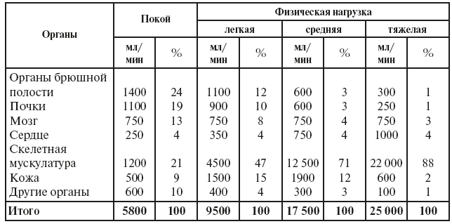 Распределение кровотока в покое и при физических нагрузках различной интенсивности