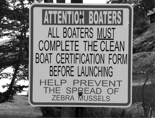 “Останови водных автостопщиков”[80] – гласит знак, установленный у озера неподалеку от моего дома. “Очистите все снаряжение”. На знаке изображена лодка, полностью заросшая речными дрейссенами, словно кто-то по ошибке покрыл ее моллюсками вместо краски.
