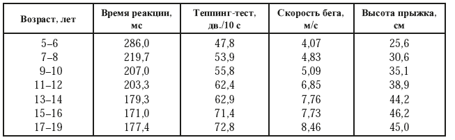 Время простой двигательной реакции на свет в 2 3 года составляет 0,6–0,8 с, к возрасту 5–7 лет это время сокращается до 0,3–0,4 с, но оно еще вдвое превышает величины у взрослых. Показатели быстроты у девочек и мальчиков не различаются в дошкольном возрасте, но в младшем школьном возрасте становятся лучше у мальчиков. С 5– до 10-летнего возраста время реакции сокращается у мальчиков с 286 до 203 мс, у девочек – с 287 до 231 мс (табл. 20).