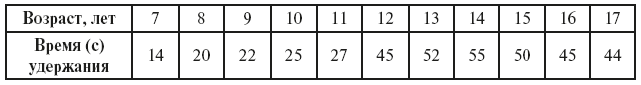 В возрасте 8-10 лет нарастает скоростно-силовая выносливость при прыжках вверх. Статическая выносливость при поддержании статических поз (см. табл. 21) и при выполнении статической работы (в упражнениях вис, упор и пр.) невелика. Статические усилия не рекомендуются дошкольникам, так как вызывают у них неблагоприятные реакции сердечно-сосудистой системы, сопровождаются сильно выраженным феноменом статических усилий (после рабочих усилений дыхания и сердцебиения) и требуют длительного восстановления. У младших школьников даже при небольших локальных напряжениях нарастание легочной вентиляции и потребления кислорода замедлено, электрическая активность работающих мышц резко увеличена, появляется напряжение на неработающих мышцах. С 8 до 11 лет статическая выносливость увеличивается на 40–50 %, ее интенсивное увеличение происходит в более старшем возрасте.