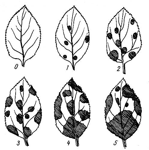Для учетов пользовались методикой, предложенной Украинским научно-исследовательским институтом садоводства, согласно которой для оценки стойкости сортов яблони против парши пользуются 5-балльной шкалой (И. И. Белоус, 1960) (рис. 5 и табл. 7).