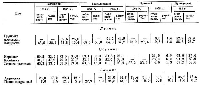 Автором в 1964—1965 гг. проводились наблюдения относительно поражаемости районированных стандартных сортов яблони в различных климатических зонах Ленинградской области.
