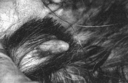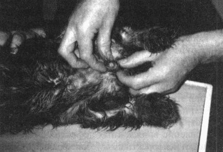 Интерсексуальные животные, фенотипически являющиеся самками. Наиболее распространенным отклонением является гипертрофия клитора у животных, по внешним признакам относящихся к самкам (фиг. 4.9). Клитор небольших размеров выступает между половыми губами или в месте их разделения. При его пальпации обнаруживается кость клитора. Как правило, дефект становится заметным в 3–4 месяца. При сохранении гормональной активности тестикулярной ткани размеры клитора могут увеличиваться, что обычно наблюдается в период полового созревания (в возрасте 4–6 месяцев).