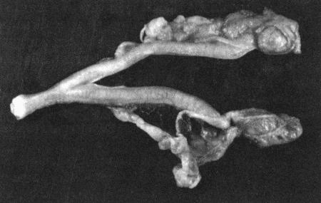 Репродуктивный тракт интерсексуального животного, фенотипически являющегося самкой. Ткани мужских и женских гонад представлены придатками семенника и рогами матки