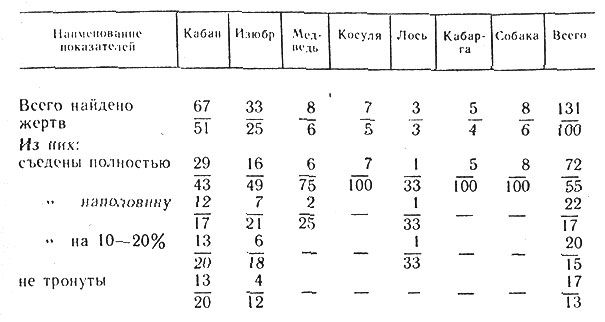 По наблюдениям Л. Г. Капланова, взрослый тигр в год давит и съедает якобы 30 крупных животных (в среднем по 100 кг в каждом), т. е. 3 т. Это, конечно, заниженные данные, но приводятся они зоологами, к сожалению, часто. В ходе личных наблюдений я пришел к выводу, что для удовлетворения пищевых потребностей среднему амурскому тигру при полном использовании добычи требуется 36 изюбров, кабанов и других крупных животных. Позже, после изучения 98 встреч поедей (жертв) тигра на Сихотэ-Алине, было подсчитано, что этот хищник полностью съедает добытых животных лишь в 51% случаев, в 15% использует их наполовину, а в 34% - на 10-20% или бросает нетронутыми. Было также установлено, что в год тигр давит не менее 45-50 кабанов и изюбров, 3-4 медведей, 6-8 косуль и кабарог. Вероятно, справедливо считает исследователь Б. С. Райт, утверждающий, что хищники теряют около половины своей добычи.