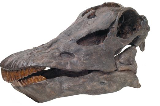 На черепе камаразавра можно увидеть типичные признаки макронариев: короткие мощные челюсти и огромное отверстие для ноздрей (большая дыра спереди)
