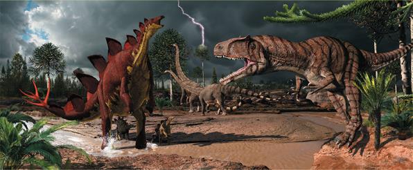 В поздней юре на западе Северной Америки обитали многочисленные динозавры, известные по превосходным, хорошо сохранившимся скелетам, – среди них изображенные здесь стегозавр, аллозавр и диплодок. Благодаря богатым костеносным отложениям в Колорадо, Вайоминге и других местах мы знаем, что эти динозавры действительно жили вместе