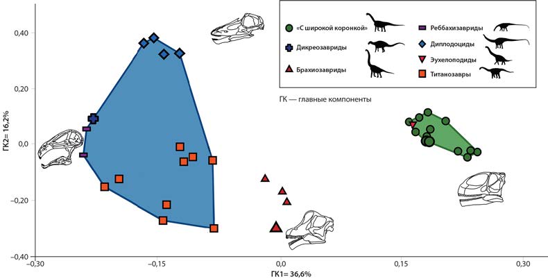 По форме черепов и зубов завроподы делятся на два основных кластера. Слева – завроподы с узкими зубами, справа – с широкими. Представители кластеров явно отличались стилем питания и предпочитаемой пищей. У нескольких видов завропод зубы имели промежуточную форму