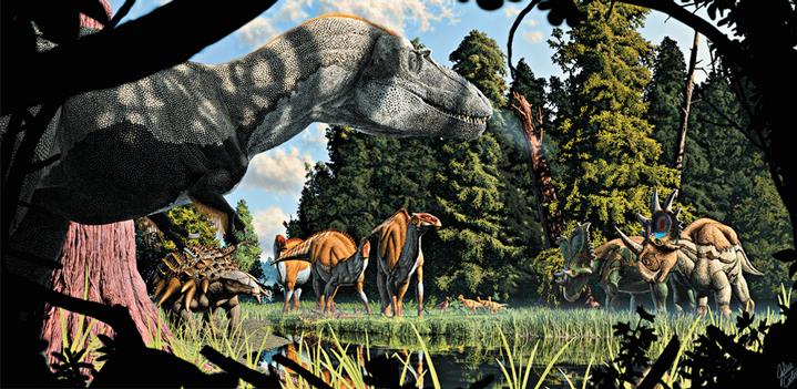 Особенно богатые динозавровые фауны известны из верхнемеловых отложений западной части Северной Америки. На рисунке – некоторые из динозавров, которые жили одновременно в кампанском веке на территории современной Монтаны. Тираннозаврид горгозавр (слева) наблюдает за анкилозавром эдмонтонией, гадрозавром брахилофозавром, небольшим пахицефалозавром стегоцерасом и цератопсами хасмозавром и стиракозавром