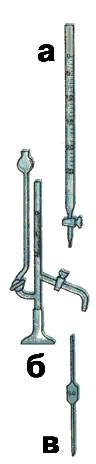 Химическая посуда для проведения анализа воды: а — бюретка; б — микробюретка; в — пипетка