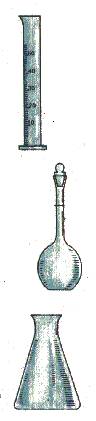 Химическая посуда для проведения анализа воды: а — мерный цилиндр; б — мерная колба; в — коническая колба