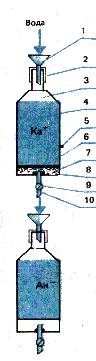 В воронку верхней колонки наливают водопроводную воду (или 5 %-ный раствор чистой соляной кислоты при регенерации катионита, который прекратил способность обменивать катионы). В этой колонке катионы металлов, в том числе кальция и магния, обмениваются на катионы водорода (Н). Вода попадает в нижнюю колонку, где анионы кислотных остатков обмениваются на анионы гидроксильной группы.
