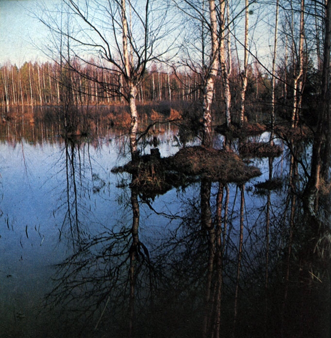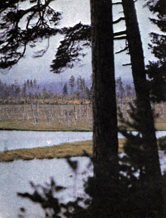 Многолетние колебания температур, осадков, обводненности водоемов, которые могут не совпадать по времени и длительности, влияют на растительность более всего в критических местообитаниях, связанных в Западном районе главным образом с озерами и болотами. После увеличения обводненности в конце XVIII - начале XIX в. и уменьшения обводненности в середине XIX в. наблюдались увеличения обводненности в 1860 - 1880, 1900 - 1910, 1930 - 1940, 1950 - 1960 гг. В эти периоды повышенной обводненности происходили гибель лесных насаждений вблизи озер и уменьшение прироста в переувлажненных местообитаниях. Расширение площадей болот сопровождалось улучшением возобновления и прироста елей по менее увлажненным местообитаниям.