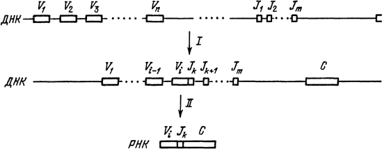 Конечно, самое интересное происходит на стадии I, т. е. тогда, когда образуется лимфоцит данного типа. Чем определяется то, какая именно пара генов V и J состыкуется, окажется рядом при вырезании участка ДНК? Это центральный вопрос, так как от этого целиком зависит строение вырабатываемого лимфоцитом иммуноглобулина.